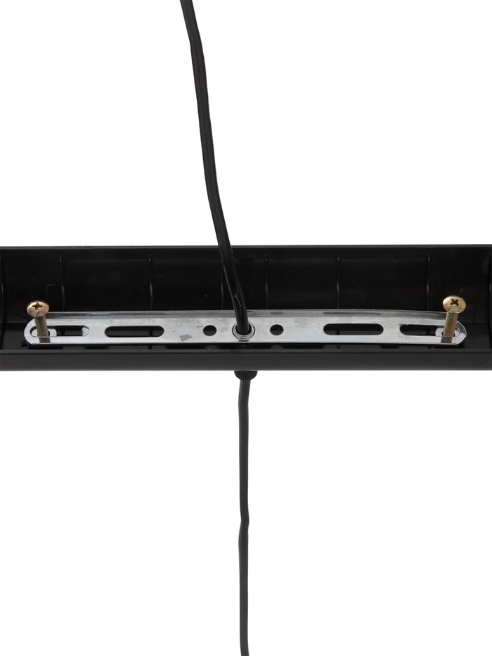 Модель рассчитана на три лампы с цоколем E27 мощностью до 40 Вт каждая, что позволяет подобрать оптимальные источники света — от тёплых ламп накаливания до энергоэффективных светодиодных. Пластиковые плафоны трапециевидной формы обеспечивают равномерное распределение светового потока, а чёрный цвет основания и рассеивателей гармонично вписывается в минималистичные и современные интерьеры. Регулируемая длина подвеса до 90 см даёт возможность адаптировать светильник под высоту потолков, а крепление на планку обеспечивает надёжность и простоту монтажа. Управление осуществляется привычным настенным выключателем, что делает эксплуатацию удобной и понятной.