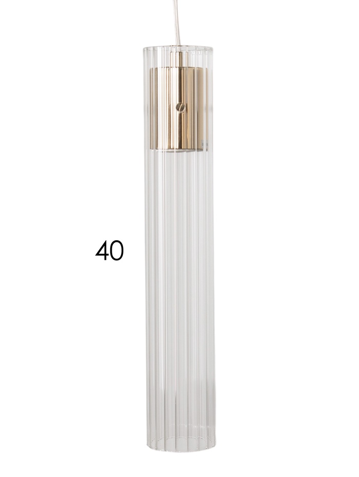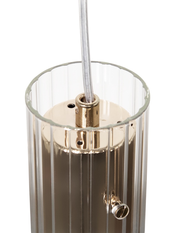 Подвесной светильник с прозрачным цилиндрическим плафоном создаёт точечное, мягкое освещение, подчёркивая современный интерьер. Золотой металлический каркас добавляет элегантности и визуальной лёгкости композиции.