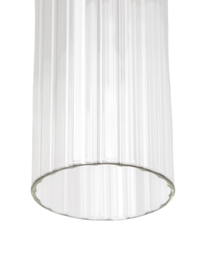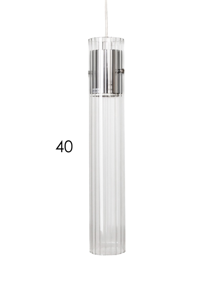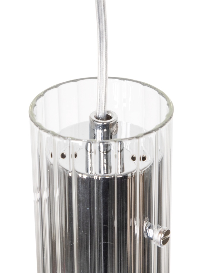 Подвесной светильник с прозрачным цилиндрическим плафоном создаёт точечное и мягкое освещение, подчёркивая современный интерьер. Хромированный металлический каркас добавляет элегантности и визуальной лёгкости, делая светильник универсальным элементом для любых помещений.