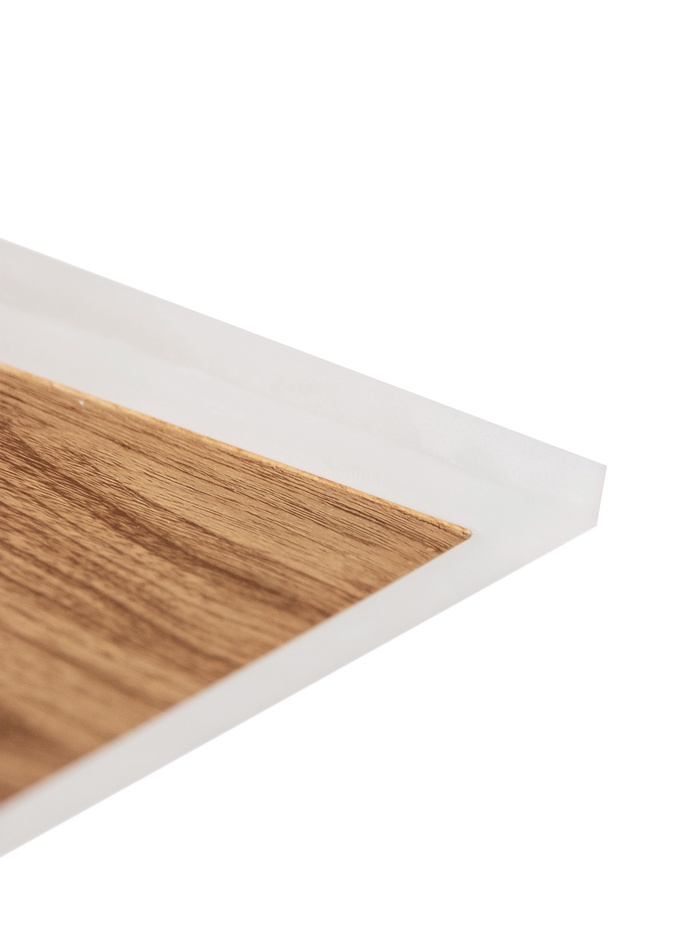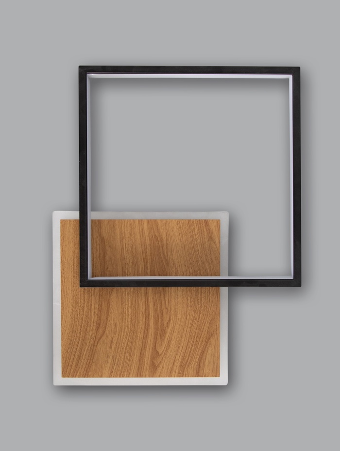 Комбинация чёрного корпуса с декоративными элементами под дерево формирует выразительный современный образ, который легко вписывается в интерьер и добавляет ему визуальной глубины. Плоская конструкция высотой всего 6 см аккуратно смотрится на потолке и не утяжеляет пространство.