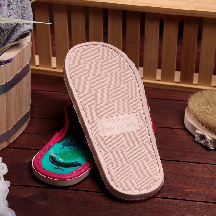 Массажные тапочки (массажные шлепанцы) с магнитами и турмалином - терапевтическое средство, обеспечивающее релаксирующий массаж стоп в домашних условиях. Идеальное решение для тех, кто страдает варикозным расширением вен, плоскостопием, нарушением кровообращения, костными шпорами и другими заболеваниями нижних конечностей. Стельки тапочек (массажные тапочки здоровье) обладают уникальной конструкцией, стимулирующей биологически - активные точки, расположенные на ногах. Применение массажных тапочек оказывает общее профилактическое и оздоравливающее действие на организм, способствует укреплению иммунитета, эффективному выведению шлаков, снятию болей и мышечной усталости, качественному улучшению сна и повышению тонуса. Износостойкая противоскользящая подошва. Тапочки массажные на ногу с высоким подъемом, на широкую ногу. Длина подошвы тапочек 25 см. Показания к применению рефлекторных массажных тапочек: бессонница, упадок сил, стресс, хронические отеки ног.