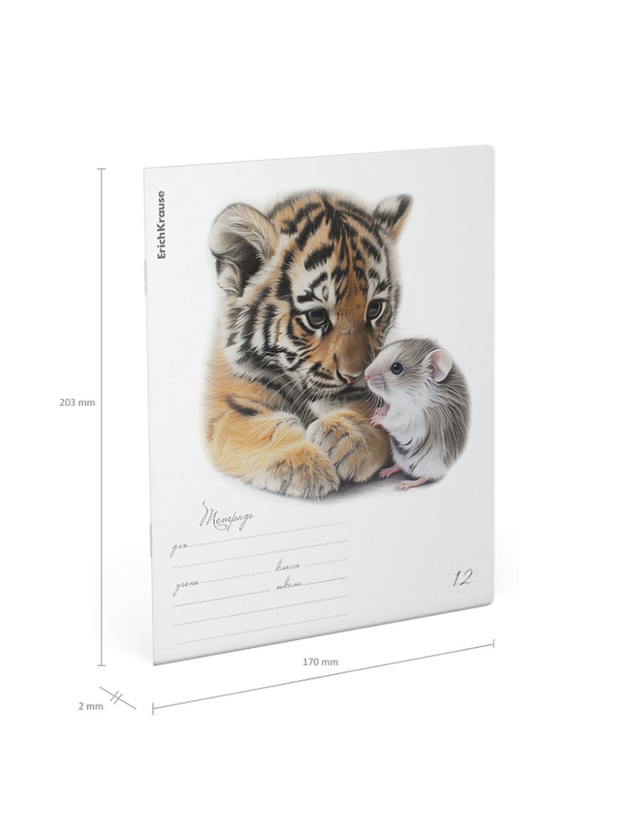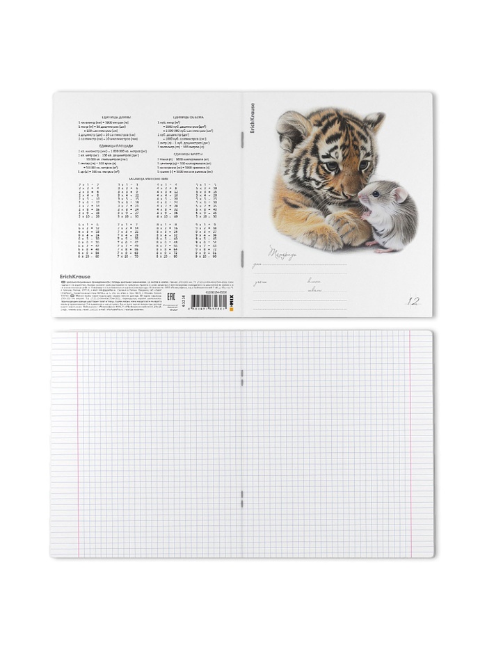 Тетрадь школьная ученическая формата А5+ (170х203 мм). Обложка из высококачественного мелованного картона плотностью 170 г/м2. В блоке 12 листов в клетку с полями. Бумага офсетная плотностью 60 г/м2. Цвет линовки - синий. Скругленные уголки обложки и блока. Тип скрепления - скоба.