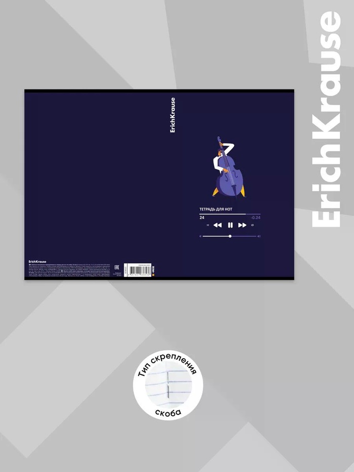 Тетрадь для нот формата А4 (210x297 мм). Ориентация - вертикальная. Обложка из высококачественного мелованного картона плотностью 170 г/м2. В блоке 24 листа. Бумага офсетная плотностью 65 г/м2. Цвет линовки - чёрный. Тип скрепления - скоба. Имеет справочный материал.