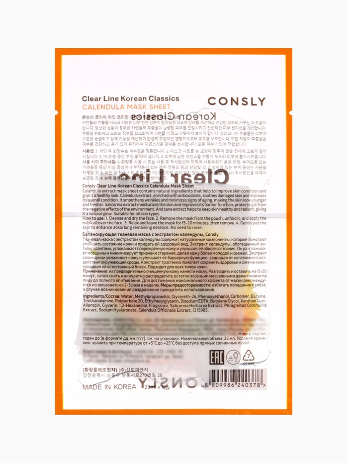 Тканевая маска Consly с экстрактом календулы создана для ухода за кожей лица, которой требуется увлажнение, успокаивающее воздействие и защита от неблагоприятных внешних факторов. Экстракт календулы известен своими противовоспалительными, успокаивающими и антиоксидантными свойствами, что делает такую маску эффективной при покраснениях, раздражениях и чувствительности кожи. Натуральные компоненты способствуют укреплению защитного барьера эпидермиса, увлажнению и восстановлению оптимального уровня влаги, а также помогают поддерживать более ровный и здоровый тон кожи.