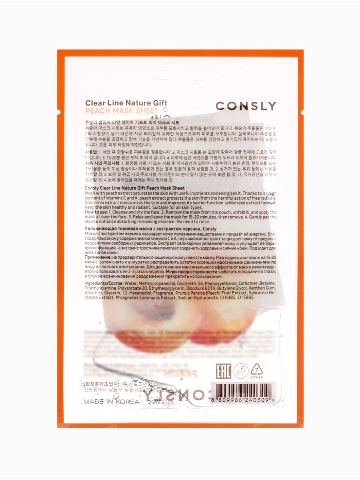 Тканевая маска Consly с экстрактом персика предназначена для ухода за кожей лица с акцентом на увлажнение, питание и придание здорового сияния. Экстракт персика является богатым источником витаминов C и A, которые действуют как антиоксиданты, защищая кожу от вредного воздействия свободных радикалов и поддерживая её естественную защиту. Витамин C способствует улучшению цвета лица и придаёт сияние, а витамин A поддерживает процессы обновления клеток и помогает сохранить упругость кожи.