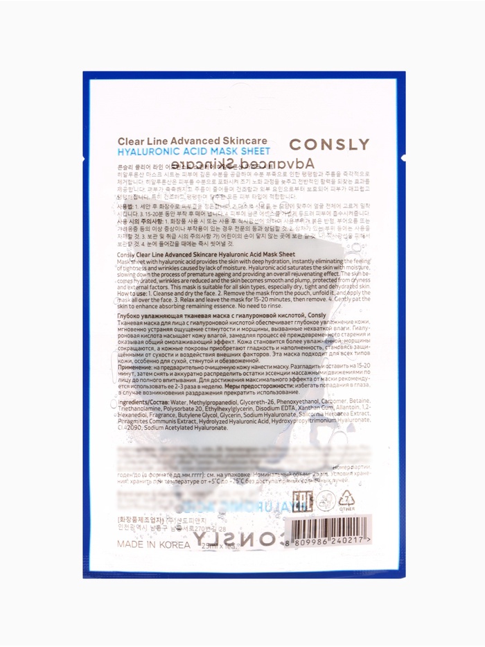 Тканевая маска для лица с гиалуроновой кислотой Consly « Глубокое увлажнение», 23 мл