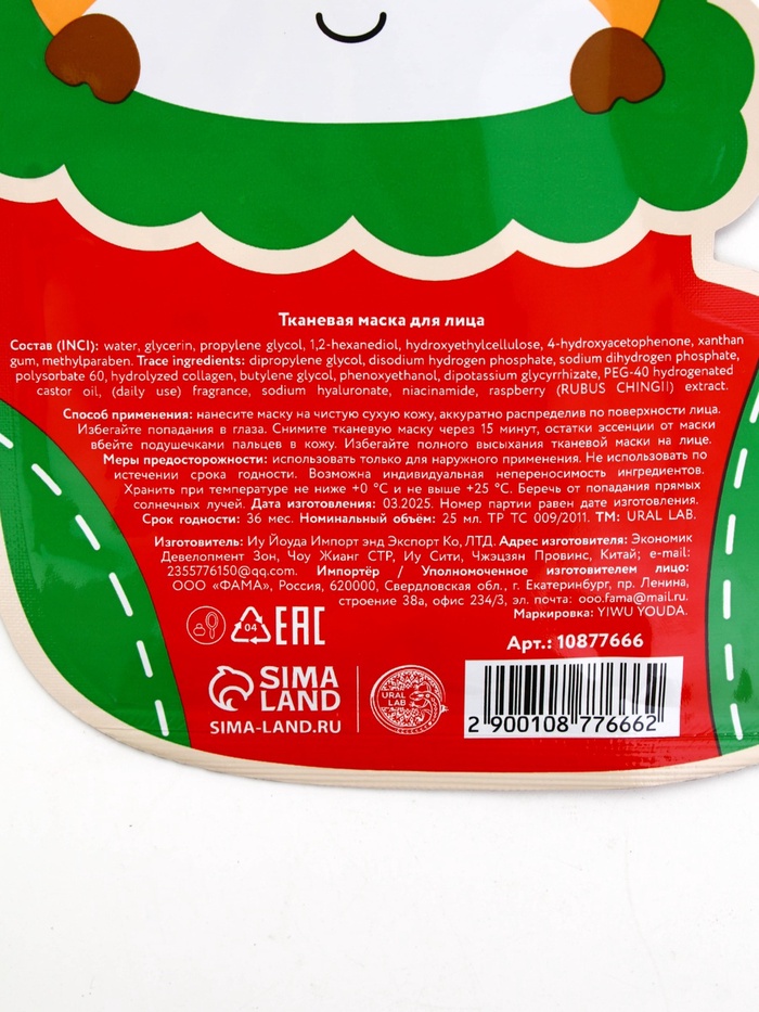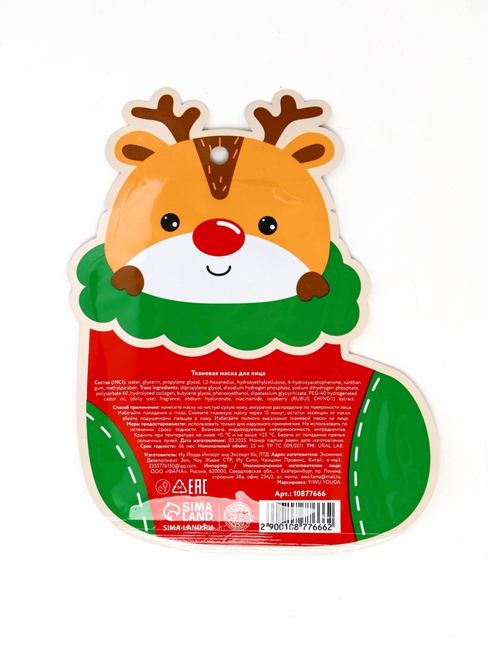 Тканевая маска для лица увлажняющая, экстракт малины и гиалуроновая кислота, URAL LAB