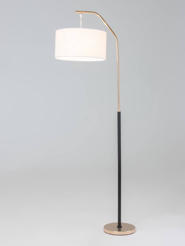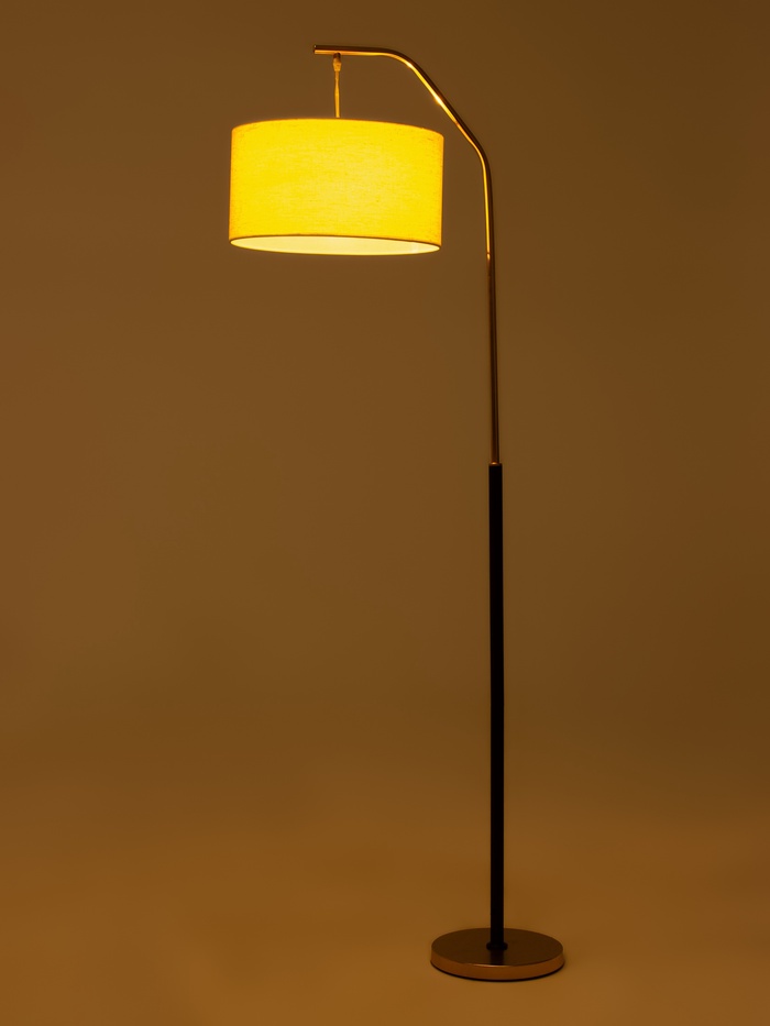 - Классика в современном прочтении: Золотистая металлическая стойка и белый абажур — отсылка к традиционным интерьерам, но без вычурности. Такой торшер уместен в классической гостиной с деревянной мебелью, а также в современном пространстве, где важны акценты и текстуры.
