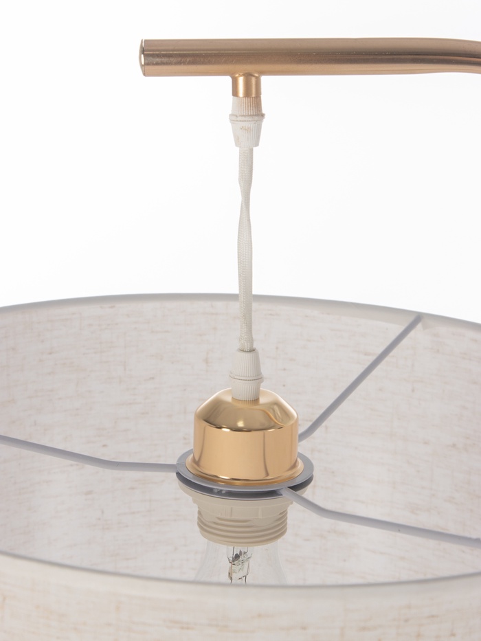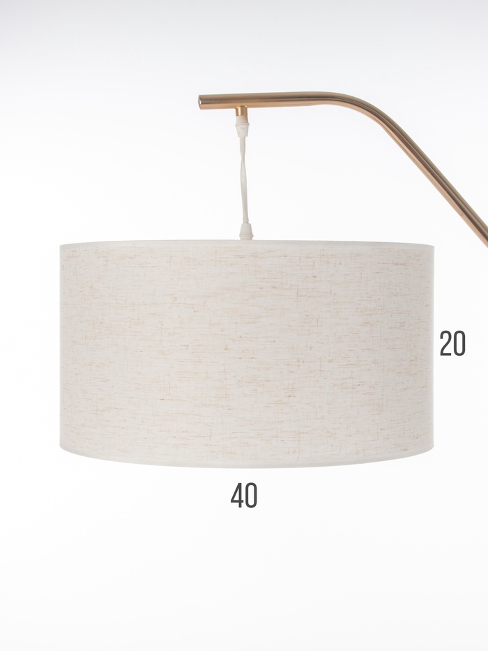 Свет с оттенком благородства. Напольный торшер с золотистой стойкой и белым абажуром — элегантное решение для гостиной или спальни. Высота до 190 см (регулируемая) и широкий абажур диаметром 38 см создают мягкую, рассеянную подсветку, идеальную для вечернего отдыха или приёма гостей. Лампа не входит в комплект — подойдут любые источники с цоколем E27 до 60 Вт: накаливания, филаментные или энергосберегающие.