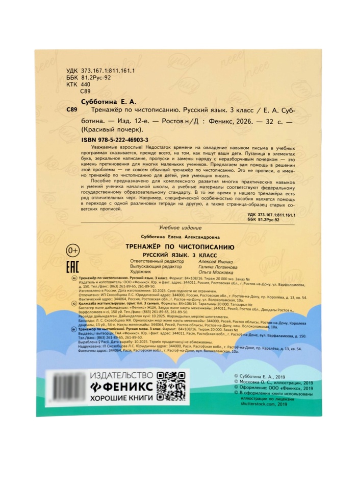 Тренажер по чистописанию «Русский язык», 3 класс, Субботина Е.А., 32 стр.