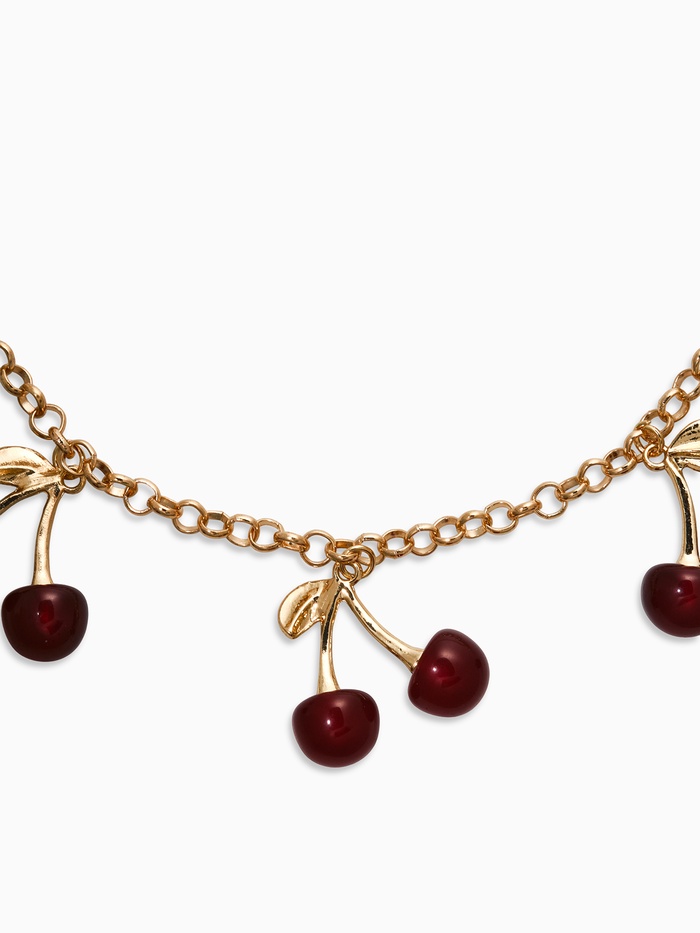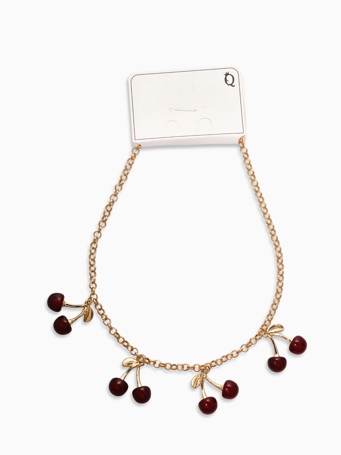 Летний десерт на шее Женская цепь с подвеской в виде вишни – очаровательный аксессуар, создающий настроение праздника и напоминающий о тёплых летних днях. Полистоуновые вишенки, обрамлённые золотом, смотрятся выигрышно и естественно, привлекая внимание к женскому образу.