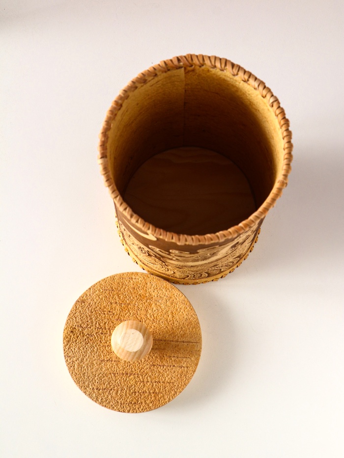 - Деревянная крышка: Крышка из дерева надежно защищает содержимое от пыли и влаги, сохраняя аромат. Сочетание бересты и дерева создает гармоничную и экологичную пару.