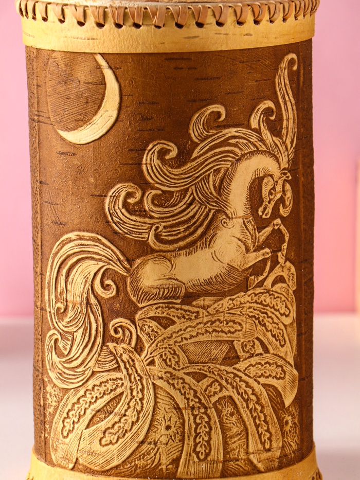 Особенности ухода: Чтобы берестяной туес долго радовал вас, рекомендуется протирать его сухой или слегка влажной тряпочкой. Мыть в посудомоечной машине и надолго замачивать в воде не следует. Берестяной туес «Конек-Горбунок» — это возвращение к истокам, дань традициям и разумный выбор для современного дома. Подарите вашим продуктам натуральное хранилище, а вашему дому — частичку русского стиля.