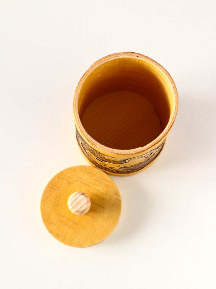 - Ручная работа и рельеф: Каждый туес имеет уникальную текстуру — поверхность не бывает идеально гладкой. Это свидетельство того, что изделие сделано вручную, с сохранением естественной фактуры природного материала.