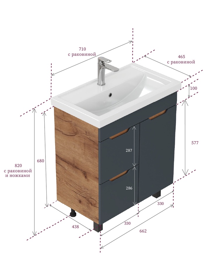 Технические характеристики Тумба напольная Onika «Айленд 70», с корзиной, с раковиной Кirovit «Фостер – 70», цвет графит/дуб крафт золотой
