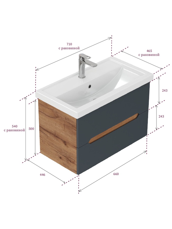 Технические характеристики Тумба подвесная Onika «Айленд 70», с раковиной Кirovit «Фостер – 70», цвет графит/дуб крафт золотой