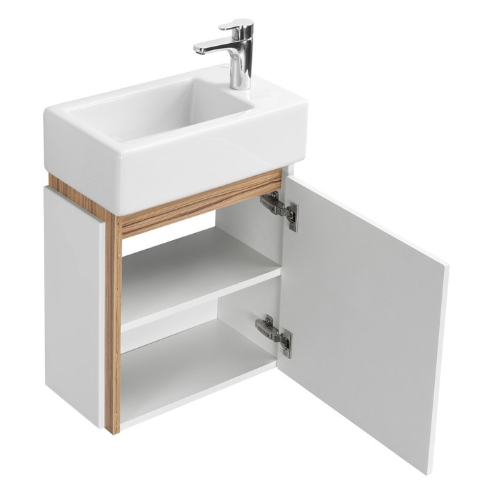 Расположение смесителя на раковине с правой стороны, петли на тумбе с правой стороны.