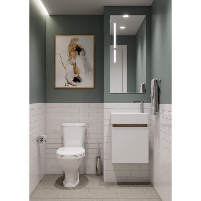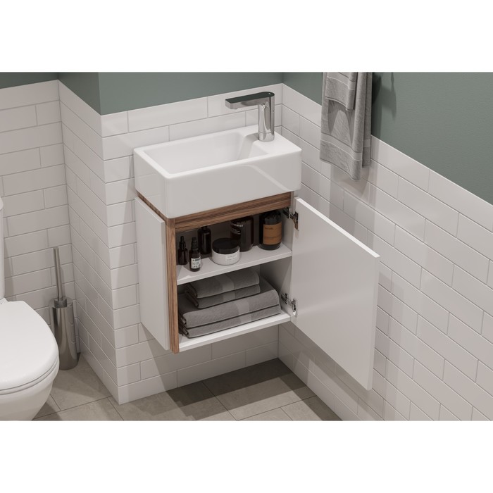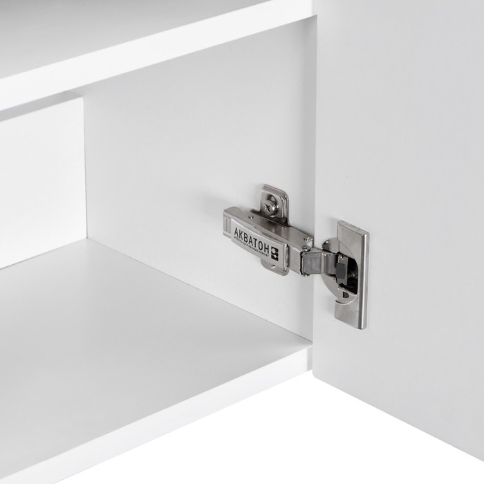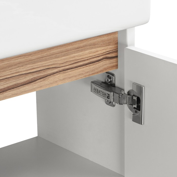 Минималистичный дизайн тумбы подчеркивает отсутствие лицевой фурнитуры. Плавное закрывание распашного фасада-створки обеспечивают петли с доводчиком.