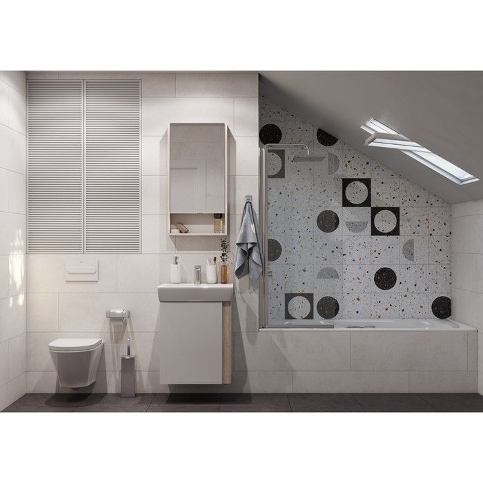 Лаконичная тумба Капри выполнена в современном дизайне: сочетание белого глянца (ВЛДСП в покраске) с древесным акцентом в цвете дуб верона (ламинированное влагостойкое ДСП). Все детали тумбы выполнены из влагостойкой ламинированной ДСП, предназначенной для использования в условиях ванной комнаты. Благодаря специальной обработке торца фасада под углом, открытие производится за створку. Регулируемые опоры в комплекте.