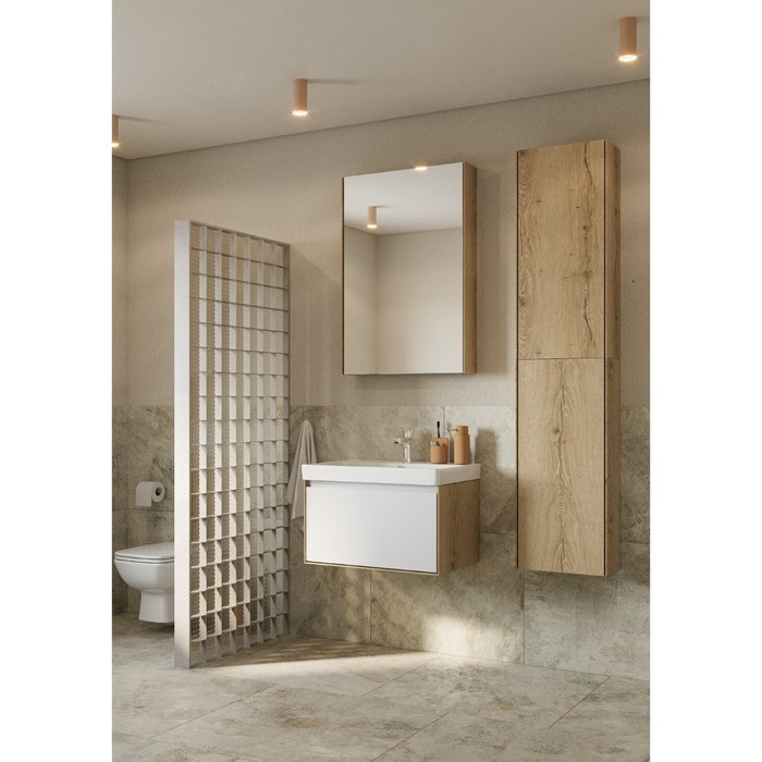 Коллекция мебели Либерти предлагает функциональные и эстетичные решения для ванных комнат. Тумбы с 1 ящиком выполнены в скандинавском стиле: сочетание теплого дерева и строгого белого глянца. Корпус и внутренняя организация тумб изготовлены из влагостойкой ЛДСП, имитирующей текстуру дерева, а фасад выполнен из влагостойкой ЛДСП в покраске белый глянец. Боковины тумб обработаны по особой технологии, создающей эффект тонких линий и в то же время сохраняющей надёжность конструкции.