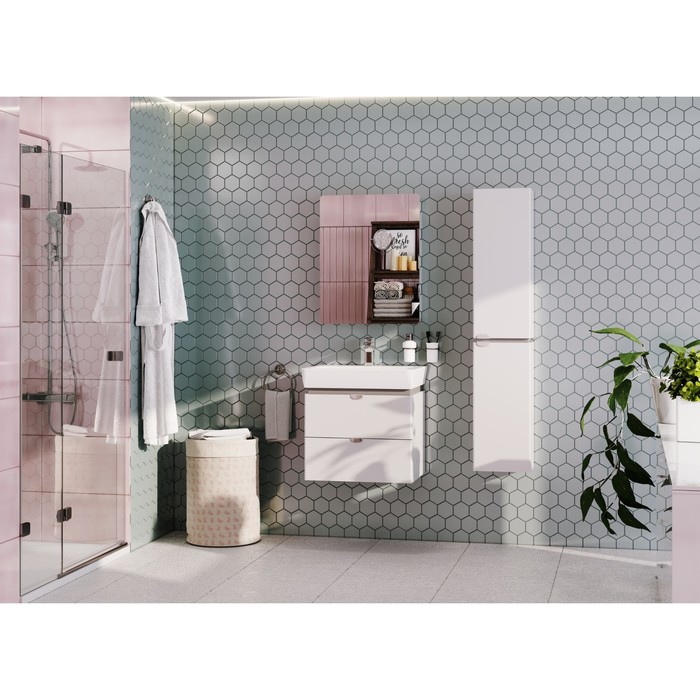 Вместительная и функциональная тумба Скай PRO 60 от AQUATON в современном стиле гармонично сочетает ультрабелые глянцевые фасады с декоративной вставкой в цвете серый кашемир — элегантное и практичное решение для удобной организации пространства в небольших ванных комнатах.