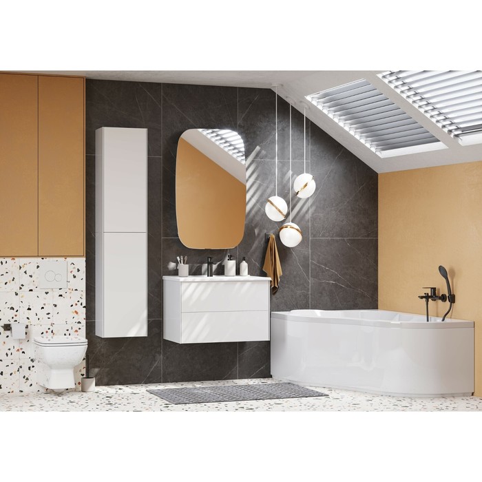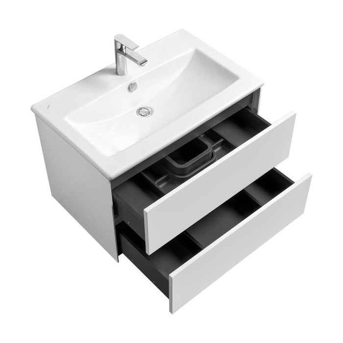 Фасады изделия выполнены из МДФ в белой глянцевой покраске, корпус из ламинированной влагостойкой ДСП в покраске белый глянец. Верхний и нижний ящики оснащены системой организации пространства, которая позволяет содержать косметические средства в идеальном порядке. Все внутренние детали тумбы выполнены в цвете антрацит.