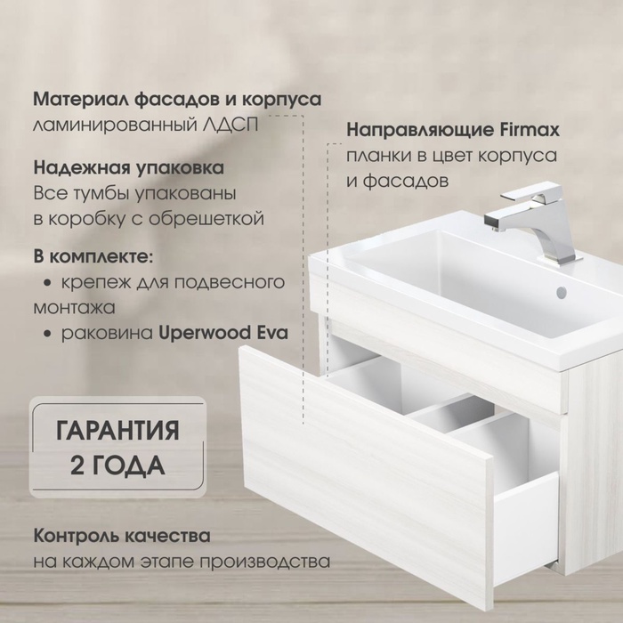 Технические характеристики Тумба подвесная Uperwood, с раковиной Uperwood Eva 75, выдвижной ящик, цвет дуб харбор белый