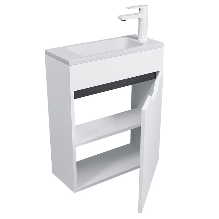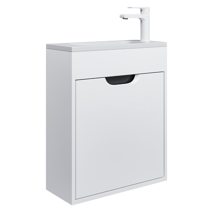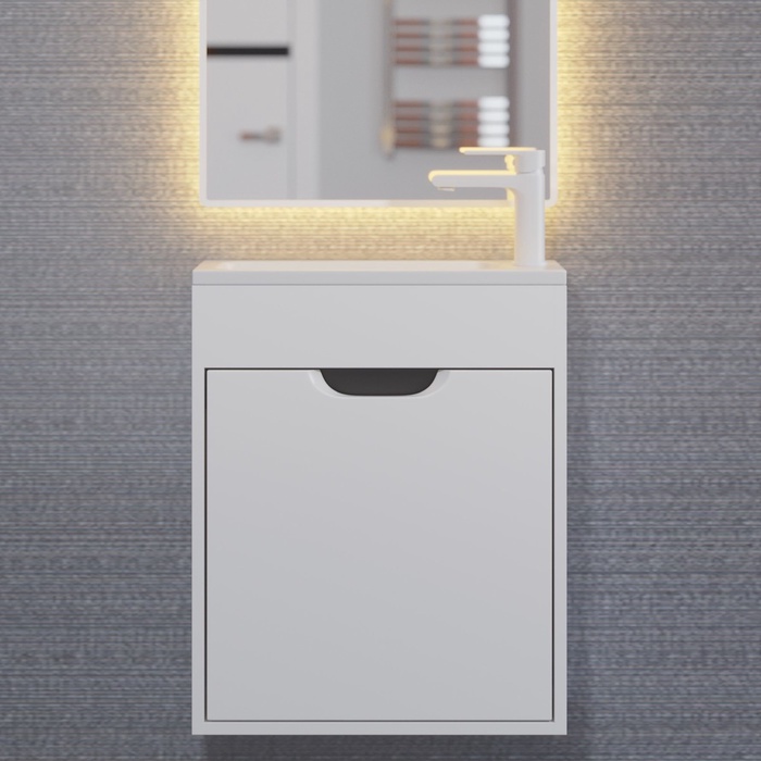 Готовый комплект для ванной комнаты от бренда Uperwood из коллекции Modul включает подвесную тумбу с распашной дверцей и раковину из литьевого мрамора. Это функциональное и практичное решение идеально подходит для современного дизайна ванной комнаты.