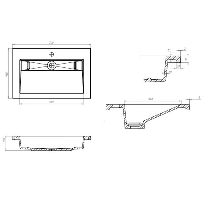 - Раковина шириной 70 см, выполненная из литьевого мрамора с белым глянцевым покрытием.