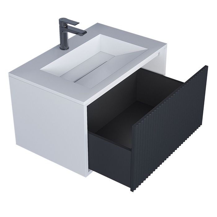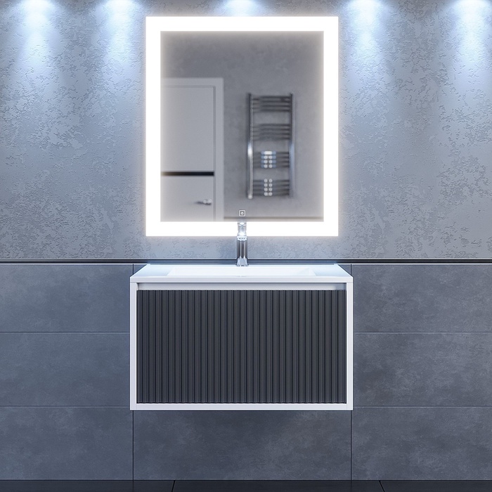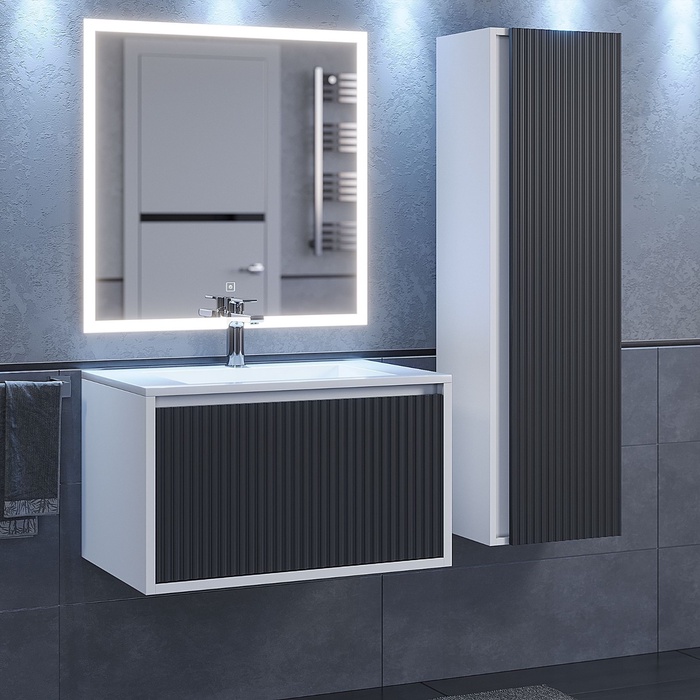- Боковины выполнены в белом матовом цвете, фасад — в цвете графит с вертикальной фрезеровкой. Элегантный минималистичный дизайн тумбы подчеркнут матовой, приятной на ощупь поверхностью Soft touch.