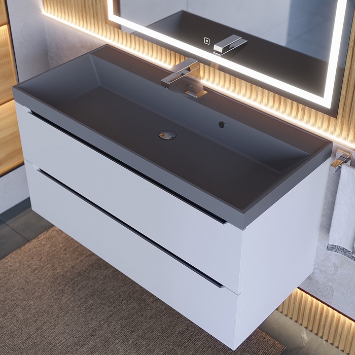 Готовый комплект для ванной комнаты от бренда Uperwood, состоящий из подвесной тумбы Tanos и раковины Classic Quartz шириной 100 см, представляет собой функциональное, надежное и практичное решение, которое идеально вписывается в любой современный интерьер ванной комнаты.