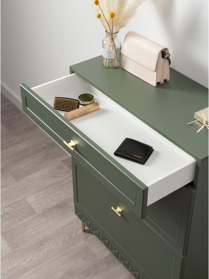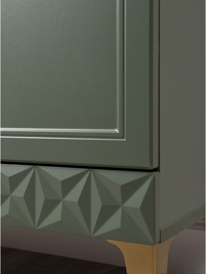 Элегантные фасады с фрезеровкой подчёркивают классический стиль модели, а насыщенный оттенок «Олива шагрень» с глубоким зелёным тоном создаёт уютную и тёплую атмосферу в интерьере.