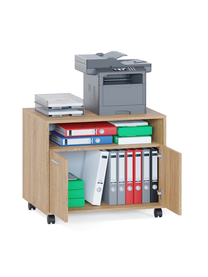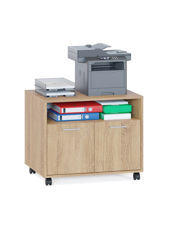 Модель оснащена открытой нишей для быстрого доступа к часто используемым предметам, а также закрытым отделением с распашными дверцами для аккуратного хранения документов и различных вещей. Просторная столешница позволяет использовать тумбу как дополнительную рабочую поверхность.