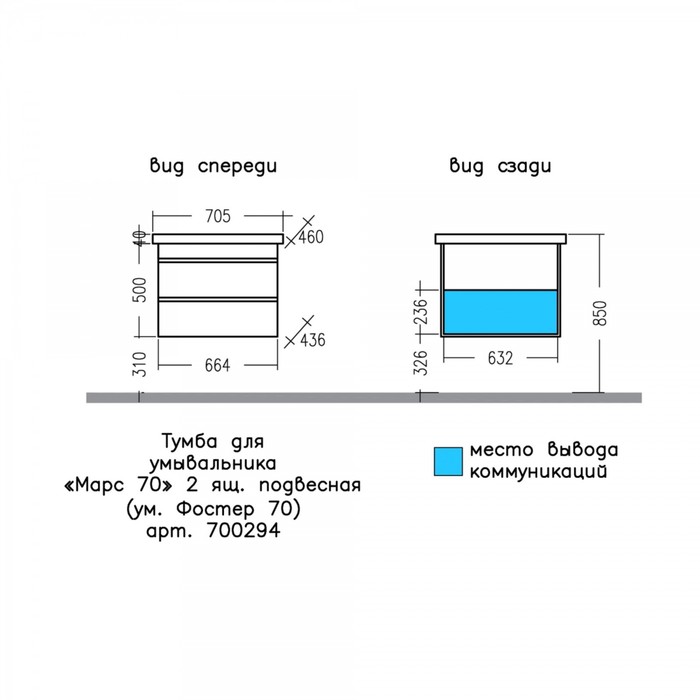 Технические характеристики Тумба подвесная «Марс 70», с раковиной «Фостер 70», 2 ящика, цвет белый