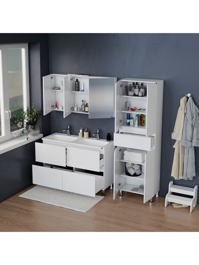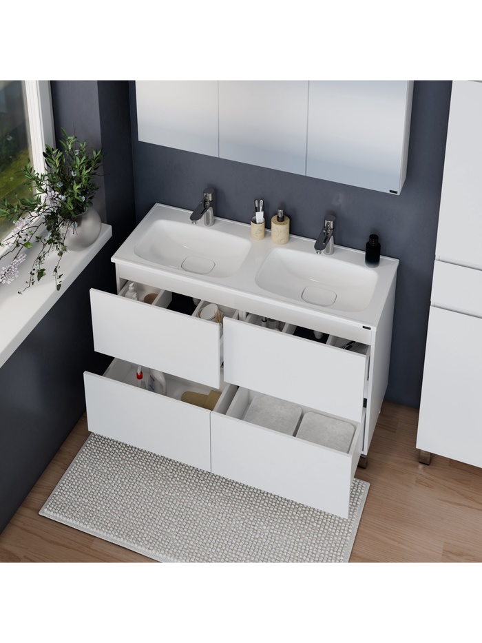 Напольная тумба для ванной комнаты с выдвижными ящиками. Предназначена для размещения умывальника и хранения бытовых принадлежностей в зоне умывания.