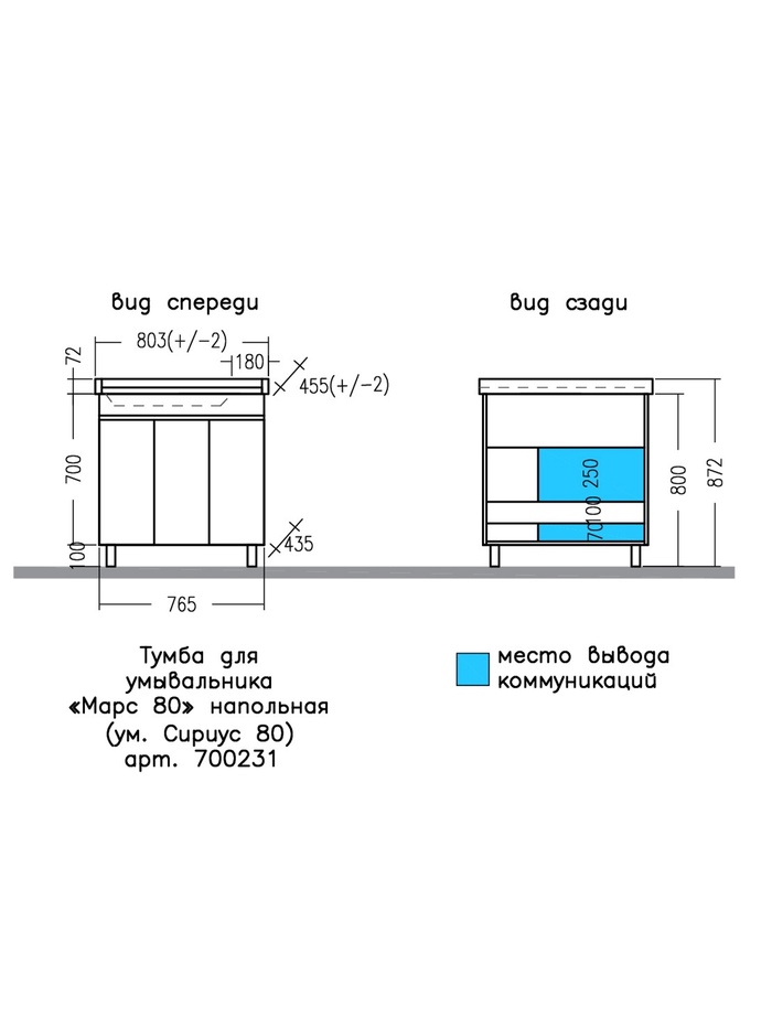 Технические характеристики Тумба напольная «Марс 80», под раковину «Сириус 80», цвет белый