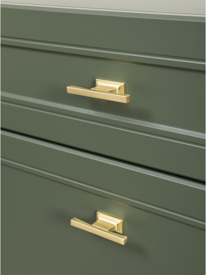 Фасады с глубокой фрезеровкой из МДФ подчеркивают утончённый дизайн, а благородный оттенок «Олива шагрень» с насыщенным зелёным тоном создаёт атмосферу уюта и гармонии. Металлические ручки и опоры золотого цвета добавляют изысканности и делают внешний вид более выразительным.