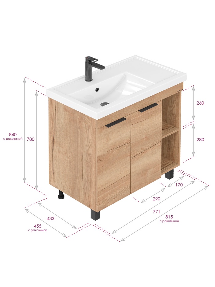 Технические характеристики Тумба напольная Onika Легран 80 раковина Фостер-80 правый Кirovit