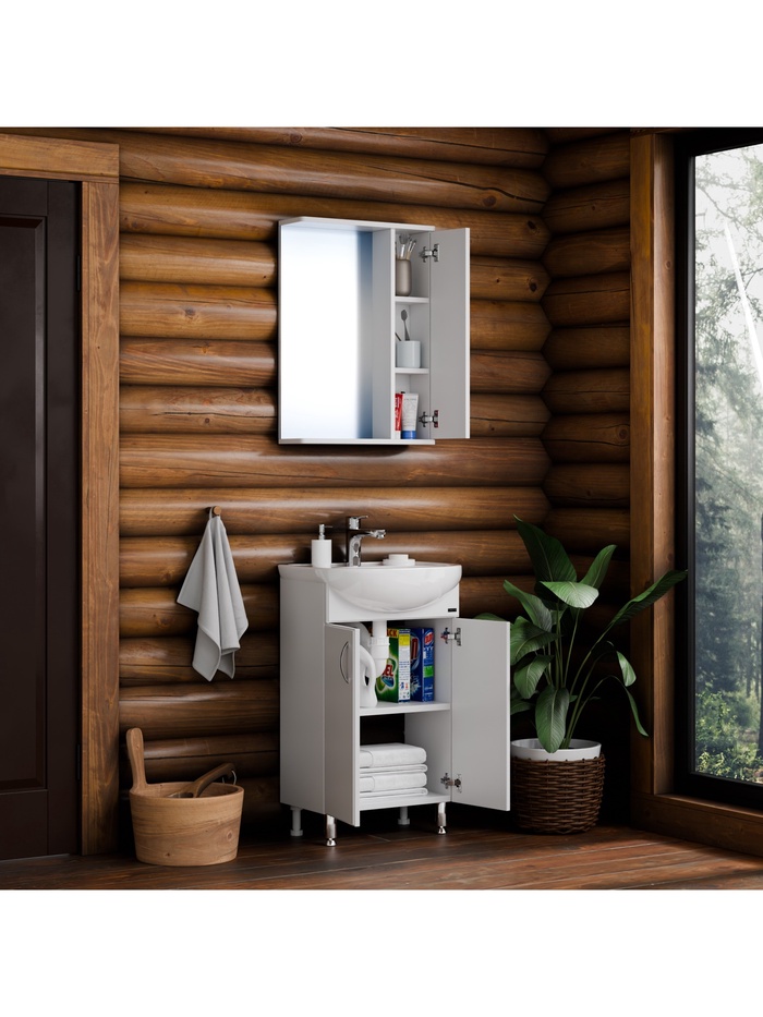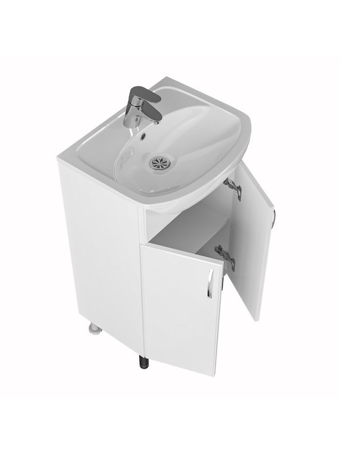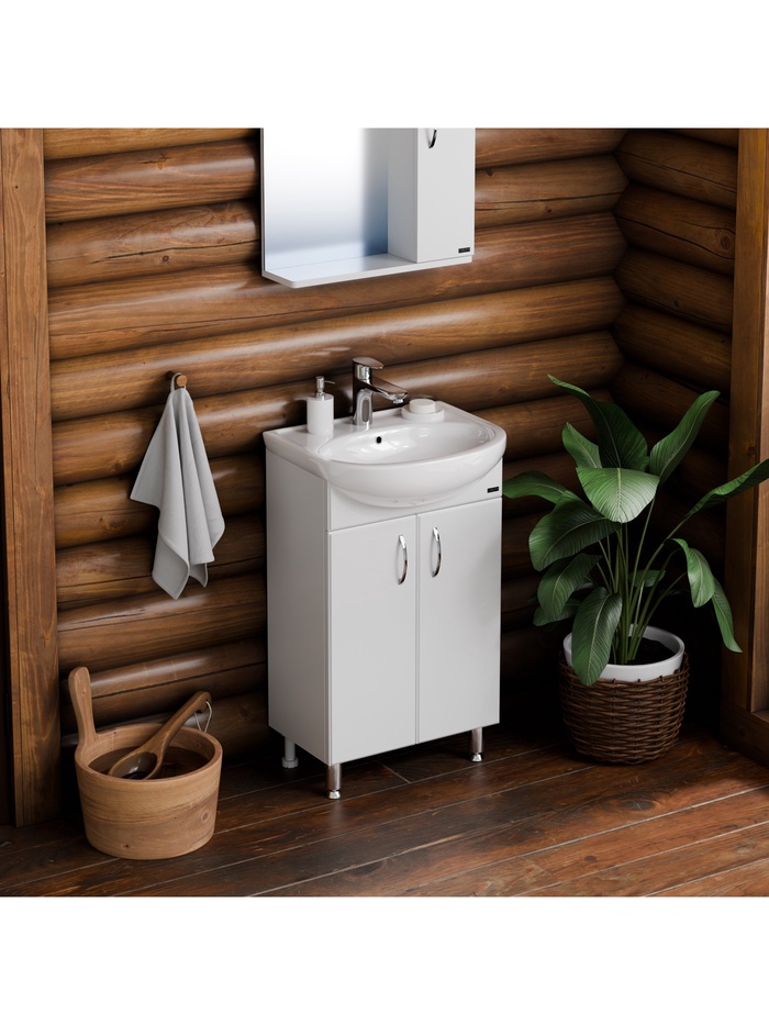 Напольная тумба для ванной комнаты под установку раковины. Предназначена для организации зоны умывания и хранения бытовых принадлежностей в компактном формате.
