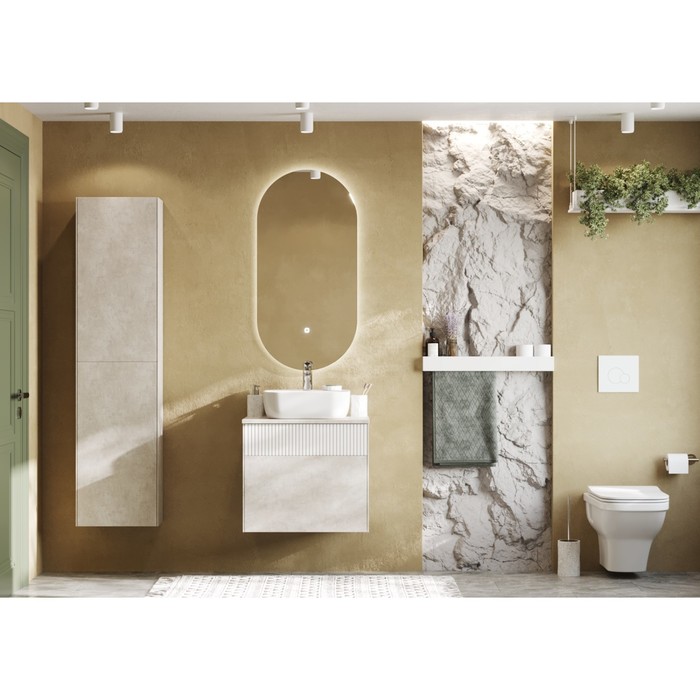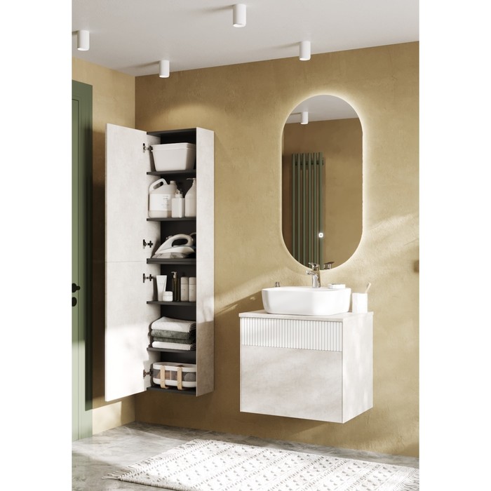 Верхний фасад изделия выполнен из МДФ с реечной фрезеровкой в белой матовой плёнке с эффектом soft touch, а нижний фасад и корпус из ламинированной влагостойкой ДСП Слэйт. Верхний и нижний ящики позволяют содержать косметические средства в идеальном порядке.