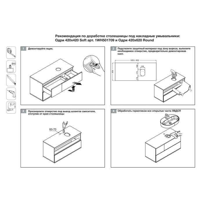 | Примечание | Оттенок данного товара может незначительно отличаться от фото/видеоизображения (в зависимости от настроек яркости вашего экрана). Раковина в комплект не входит Изготовитель оставляет за собой право вносить в конструкцию, внешний вид и упаковку изделия незначительные изменения, которые не влияют на качество продукции или улучшают его. Перед сборкой изделия проверьте качество, количество деталей, их размер и целостность в соответствии с инструкцией. Претензии после сборки не принимаются. Выгрузка товара и подъём на этаж осуществляются покупателем. |