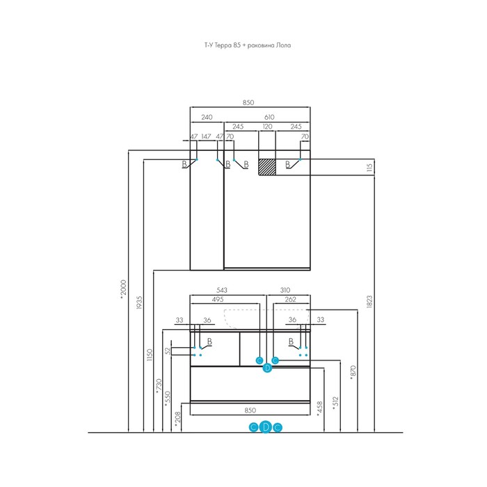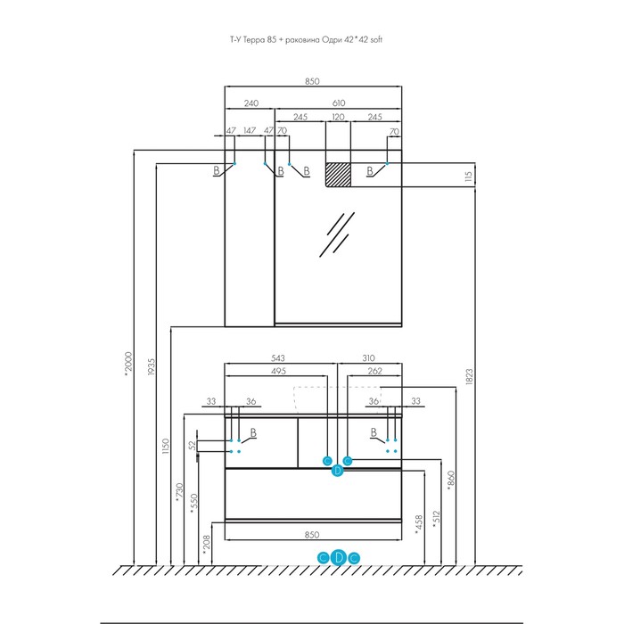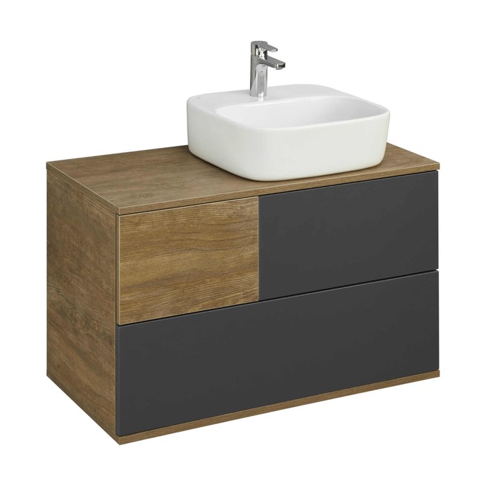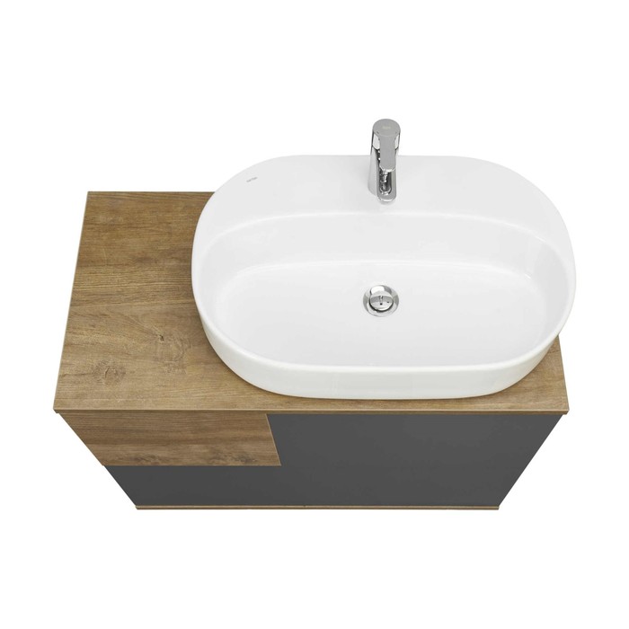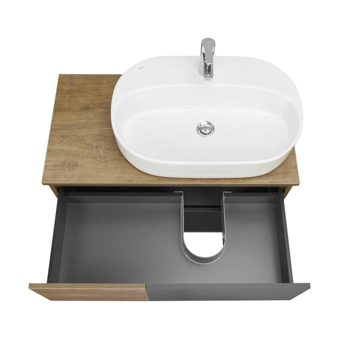 Тумба Терра 85 состоит из двух вместительных ящиков, открывающихся с помощью системы push-to-open, нижний ящик комплектуется системой организации пространства, которая препятствует смещению мелких косметических и гигиенических средств. Фасады ящиков — матовая серая плёнка антрацит, а столешница, корпус и вставка на верхнем ящике — влагостойкое ДСП с текстурой дуб кантри.