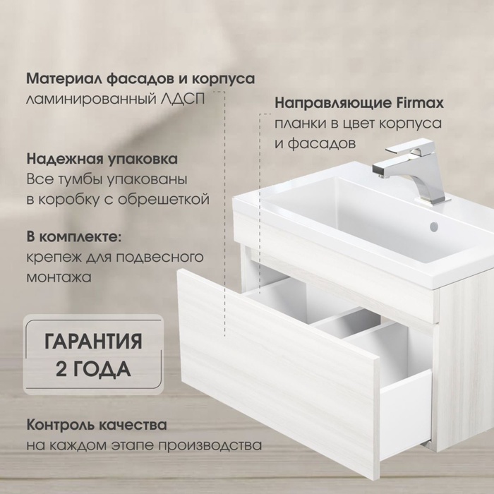 Технические характеристики Тумба подвесная Uperwood, под раковину Uperwood Eva 60, с выдвижным ящиком, цвет дуб харбор белый