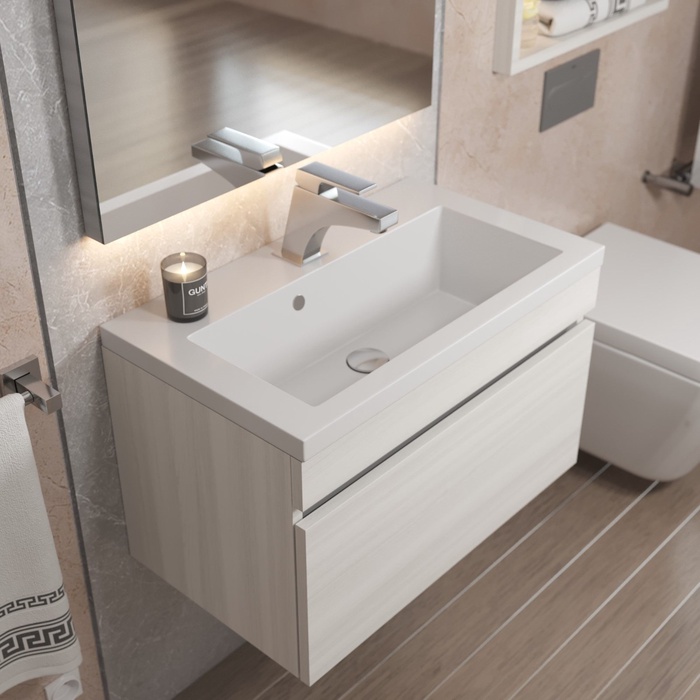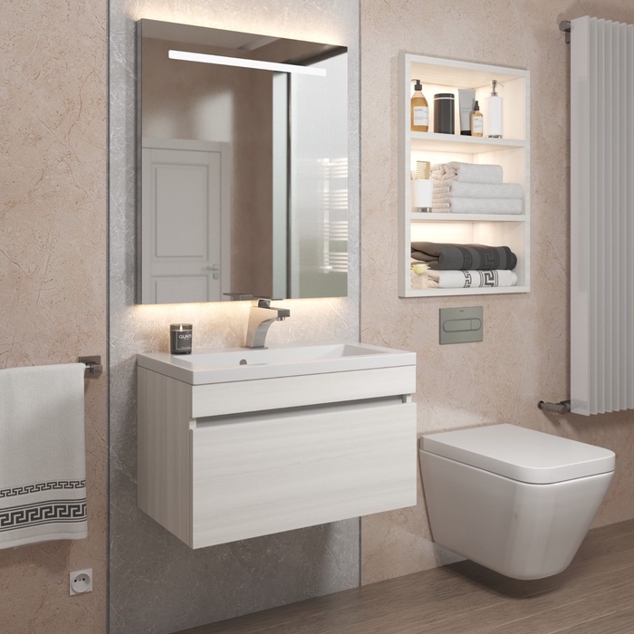 - Подвесной монтаж обеспечивает легкую уборку и визуально увеличивает пространство.