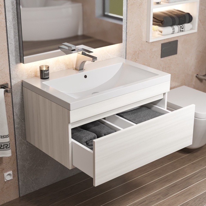 - Совместимость: для тумбы шириной 75 см подходит раковина Uperwood Eva 75 см.