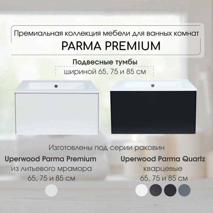 Parma Premium - консервативный дизайн и исключительно высокое качество исполнения. Премиальная коллекция мебели для ванных комнат Parma Premium от бренда Uperwood представлена подвесными тумбами шириной 65, 75 и 85 см в чёрном и белом цвете. Тумбы Parma Premium изготовлены под серию раковин из литьевого мрамора Uperwood Parma Premium и кварцевых раковин Uperwood Parma Quartz соответствующих размеров от 65 до 85 см.