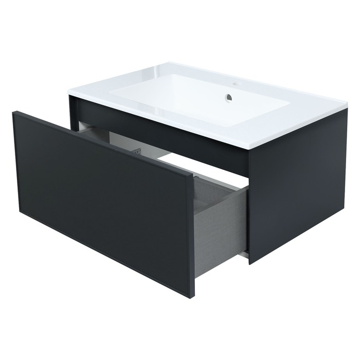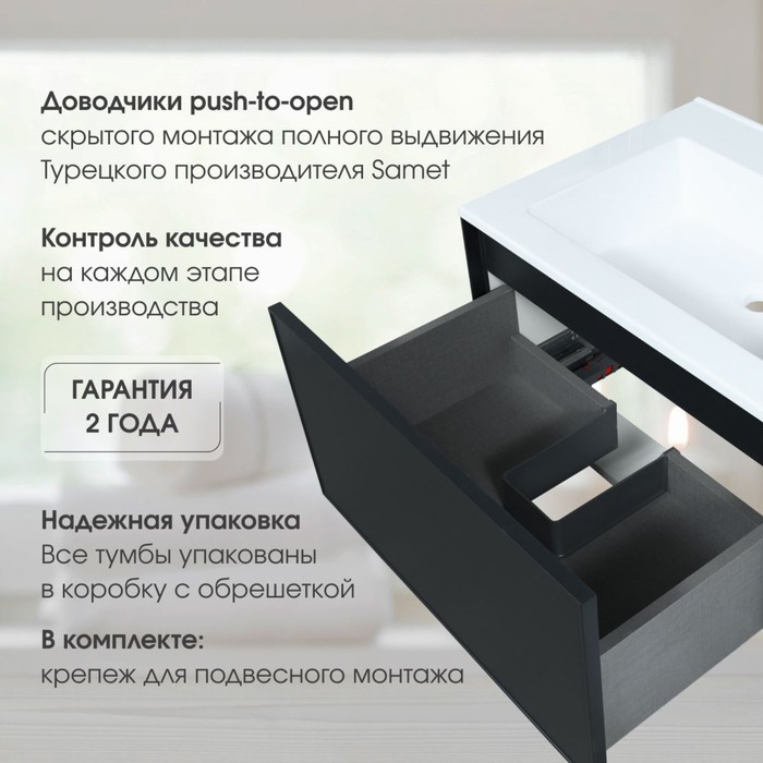 Подвесной монтаж изделия обеспечит лёгкость в уборке помещения, и визуально даст больше пространства Вашей ванной комнате. Тумбы для ванной комнаты выполнены из влагостойкого МДФ повышенной плотности, класса МВ: толщина фасада 19 мм, толщина боковин 16 мм. Выдвижной ящик изготовлен из влагостойкой ЛДСП. МДФ и ВЛДСП производство Egger. Ящик оснащён доводчиками Samet, пуш скрытого монтажа полного выдвижения. Качественное 5-слойное покрытие всех поверхностей тумбы: изолянт, 2 слоя грунтовки, высококачественная краска и лак. После каждого слоя покрытия производится шлифовка. Финальный слой (лак) придаёт тумбе интересную матовую поверхность и обеспечивает дополнительную прочность, защищая её от царапин.