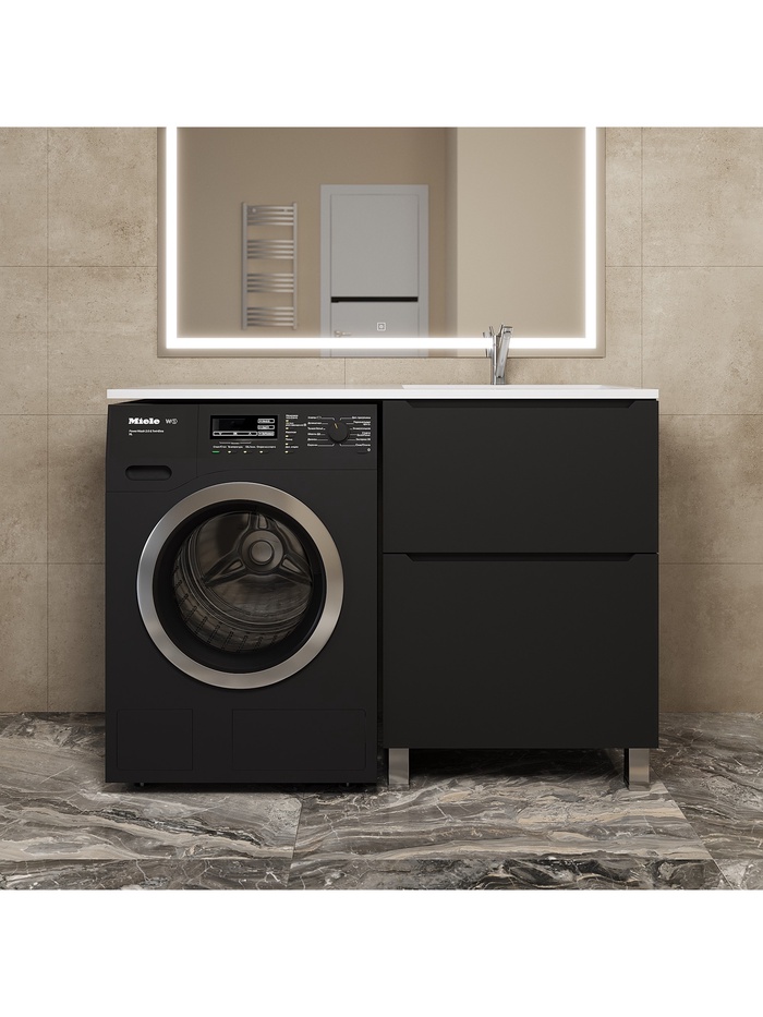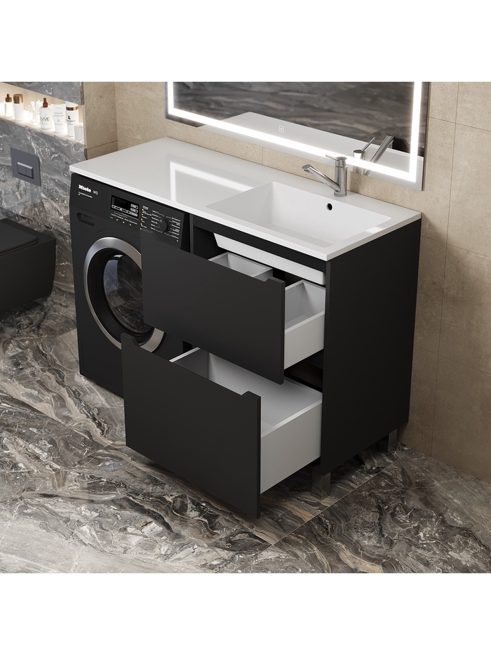 Функциональное и стильное решение для ванной комнаты. Напольная тумба выполнена в благородном чёрном цвете с матовым покрытием, которое придаёт мебели элегантность и современный характер. Модель специально разработана для установки под раковину Uperwood Tanos и идеально подходит для размещения над стиральной машиной, что позволяет максимально эффективно использовать пространство ванной комнаты. Конструкция с двумя выдвижными ящиками обеспечивает удобное хранение косметики, бытовой химии и других принадлежностей.