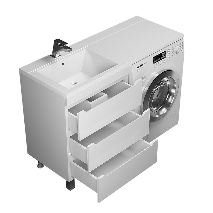 Для тумб Tanos подходит раковина Cosmos или раковина Bruks шириной 120 см. Под «крыло» раковины устанавливается стиральная машина.