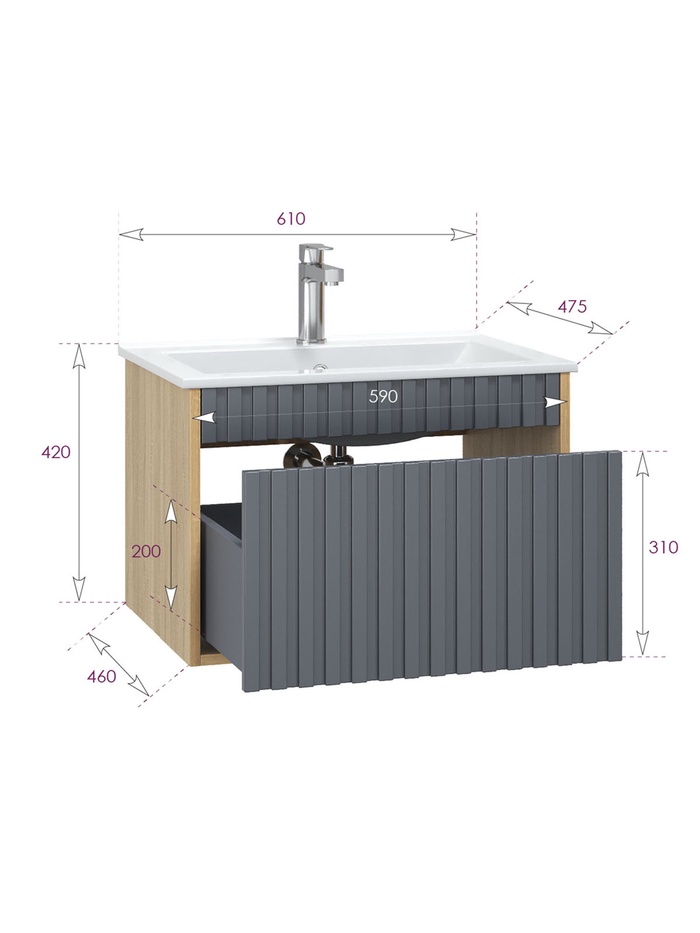 Стильное решение для современной ванной комнаты. Элегантный рифлёный фасад матового оттенка с покрытием soft touch и корпус с оттенком натурального дуба создают утончённый контраст и подчеркивают вкус владельца. Подвесная конструкция делает интерьер лёгким и визуально просторным.